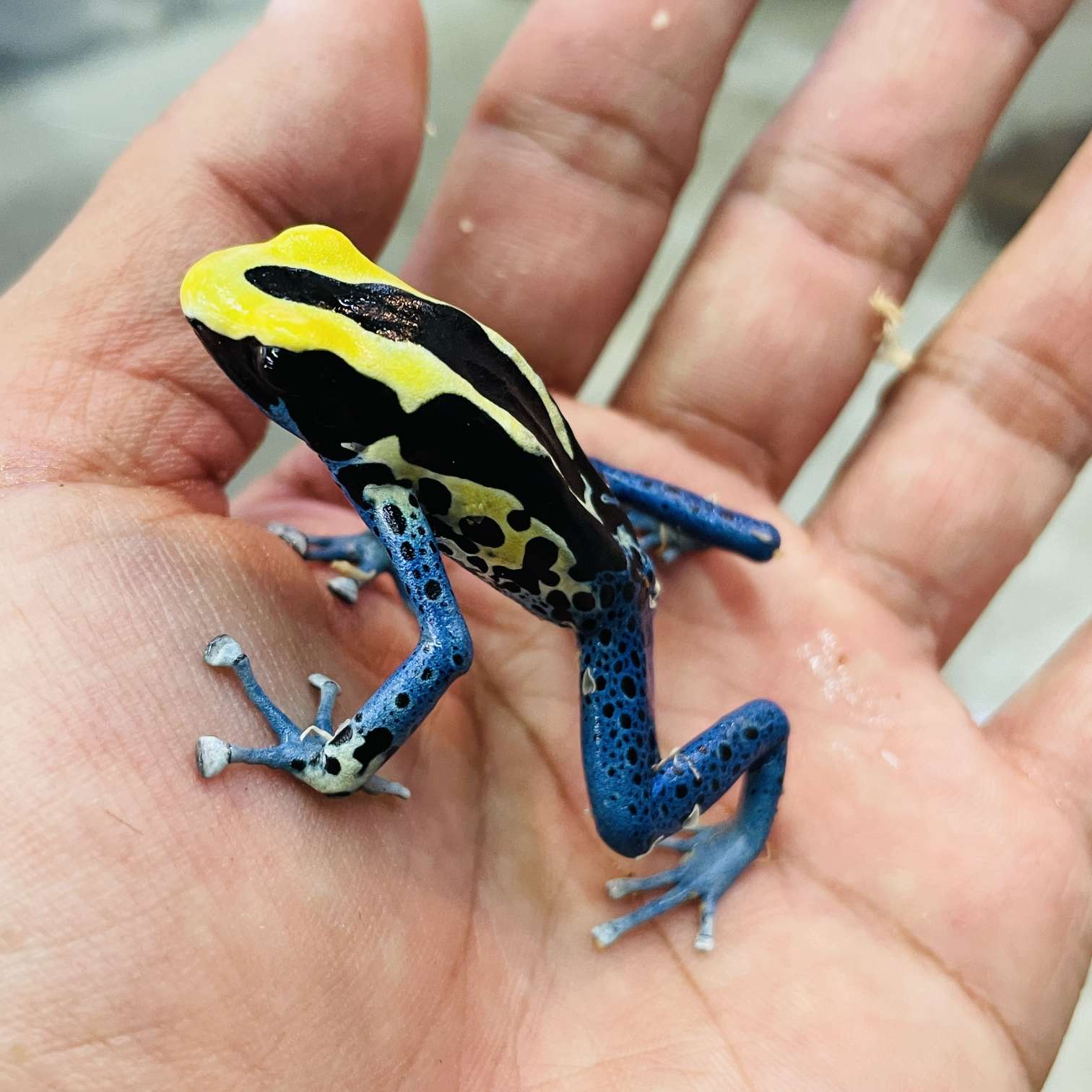 艶々ブラックに鮮烈なブルー&イエローの色彩が美しいヤドクガエルが入荷しました^^ CB無毒で安心の飼い込み個体です ※両生類全般に皮膚に微弱な毒は持っていますがこちらのヤドクガエルは飼育下繁殖個体の為、通常の野生のヤドクガエルのような猛毒はありません。一応指先等無傷の上、両生類のメンテナンス時はカエル本体への火傷を防止する為に水で濡らして冷やした手、ビニール手袋等での管理を推奨します