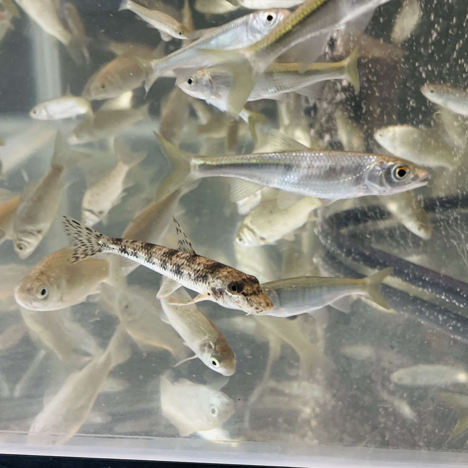 現在約5〜10cm程度のサイズが少数です 沈下タイプの人口餌に餌付きました 他種と混泳なので餌を何度も与えて素早いオイカワに食べきられる前に沈下した餌を食べるように仕向けてます^^;